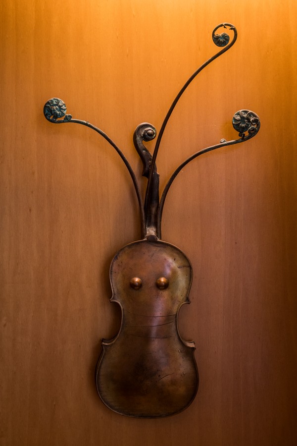 Four bronze violins at The George are part of a sculptural set developed over 13 years by Stephen Gleeson. They symbolise a series of laments, with each instrument carrying different stories and meanings.